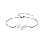 Su diseño incorpora el nombre que elijas en tipografía fluida tipo script, integrado en una cadena fina y elegante que se adapta cómodamente a la muñeca. Es una pulsera ligera y versátil, perfecta para el uso diario o para aportar un toque personal en ocasiones especiales.